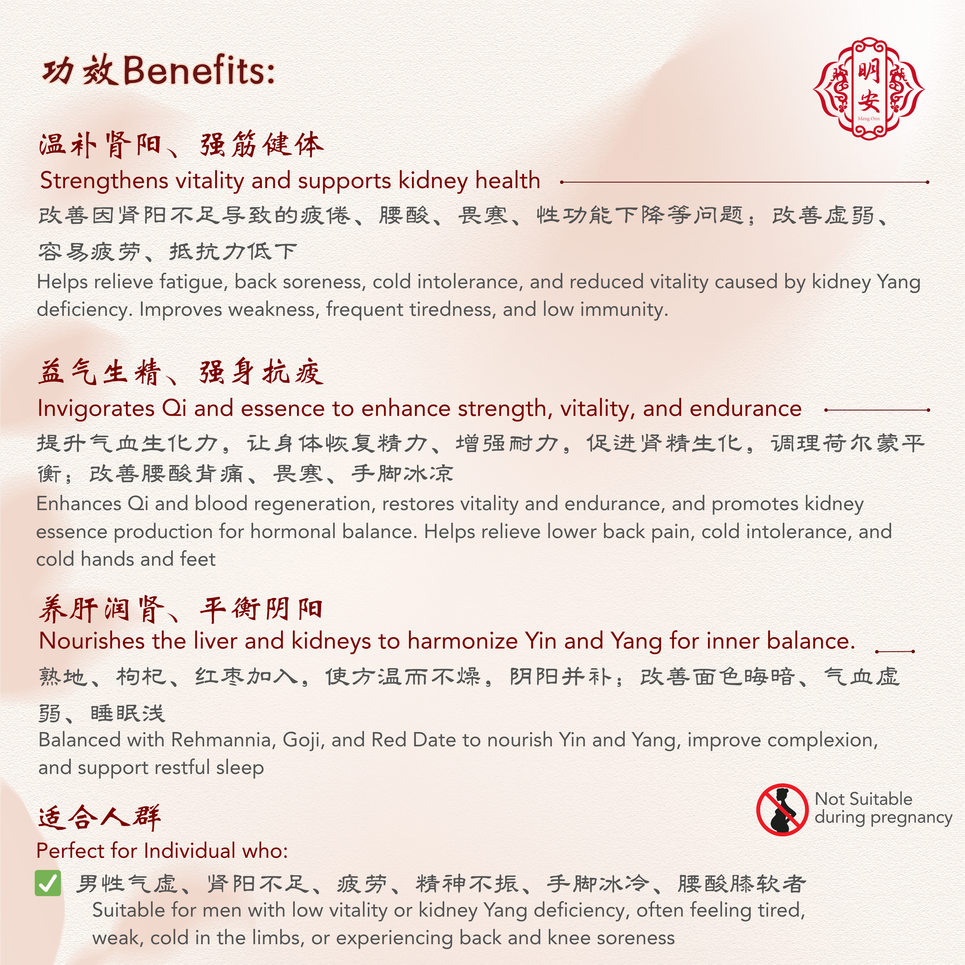 ✅Suitable for men with low vitality or kidney Yang deficiency, often feeling tired, weak, cold in the limbs, or experiencing back and knee soreness