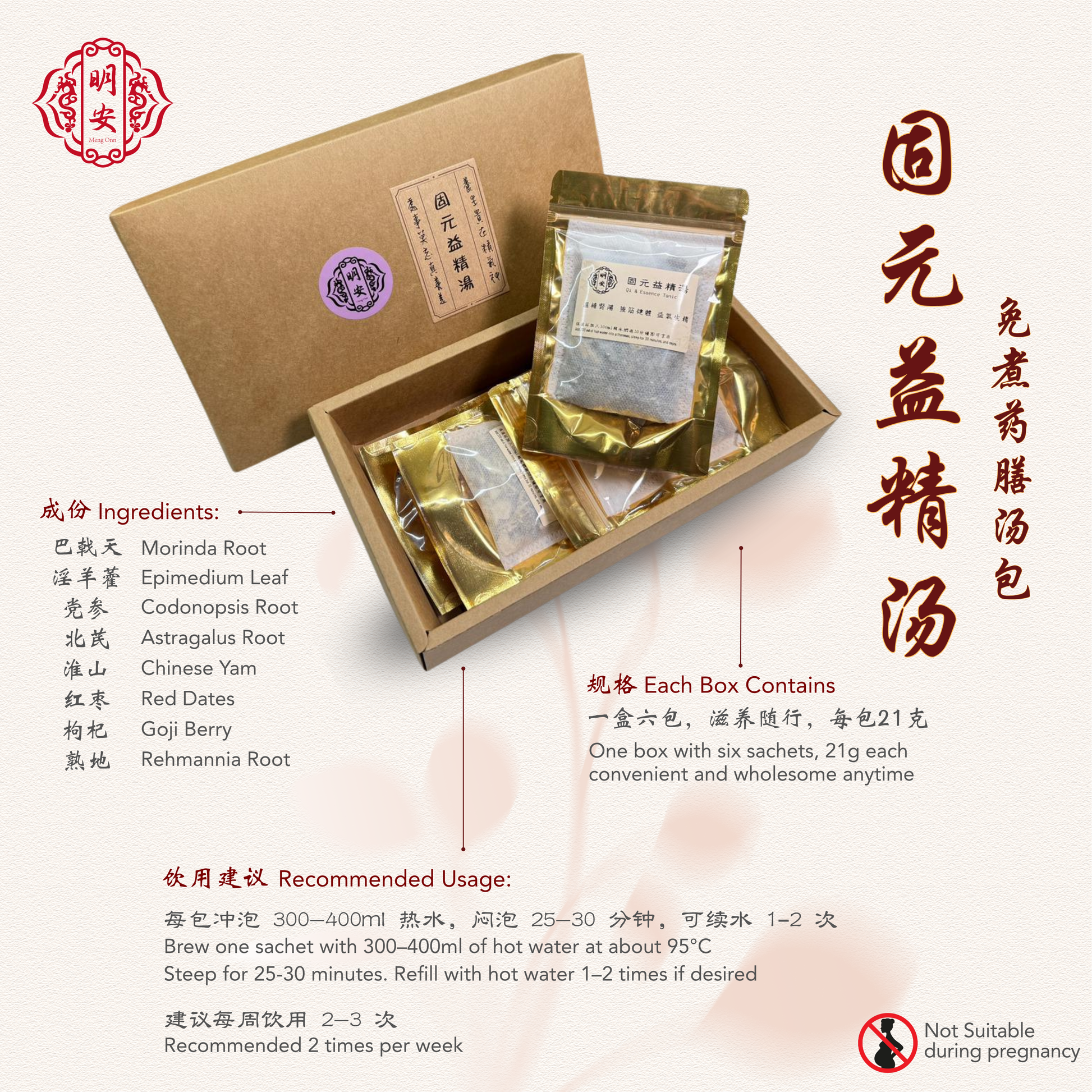Morinda Root, Epimedium Leaf, Codonopsis Root, Astragalus Root, Chinese Yam, Goji Berry, Red Date, Prepared Rehmannia Root